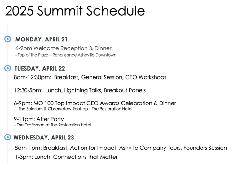 At MO, leading impact CEOs engage, learn, and forge a new path on critically important topics. The Summit includes a combination of core panel topics and deep networking. Come be part of how businesses are redefining capitalism creating solutions to the world’s pressing social and environmental issues creating enduring value through strategies that leverage the inherent link between natural, social, and financial capital.